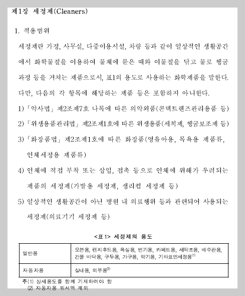 품목별 안전기준 중에서 세정제에 대한 내용을 예시로 가져와봤습니다.