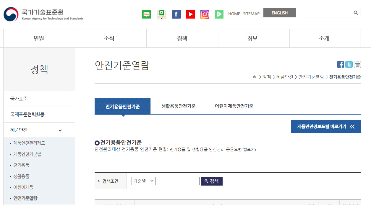 국가기술표준원 사이트 -> 정책 메뉴 -> 제품안전 -> 안전기준 열람
