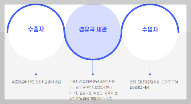 정리해 보면 물품의 원산지 국가에서 발행한 원산지증명서를 근거로 해서 경유 국가에서 그 원산지증명서와 “연결”되는 원산지증명서를 또 발급해준다는 뜻입니다.