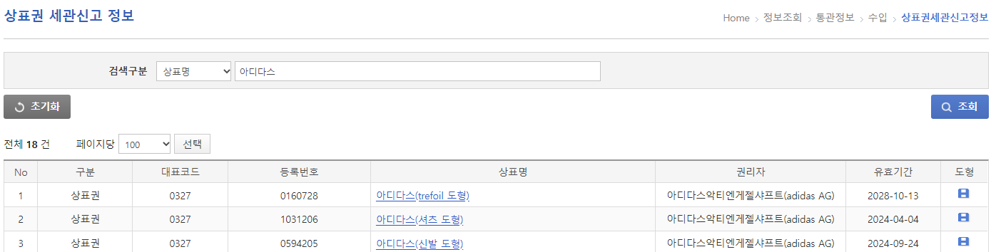 여기서 브랜드의 국내상표권자와 상표 등록번호를 확인합니다.