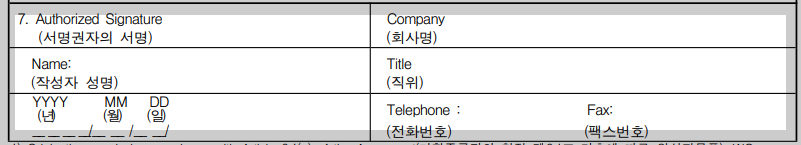 Authorized Signature(서명권자의 서명), Company(회사명), Names(작성자 성명), Title(직위), 작성연월일을 적어주면 끝-입니다.