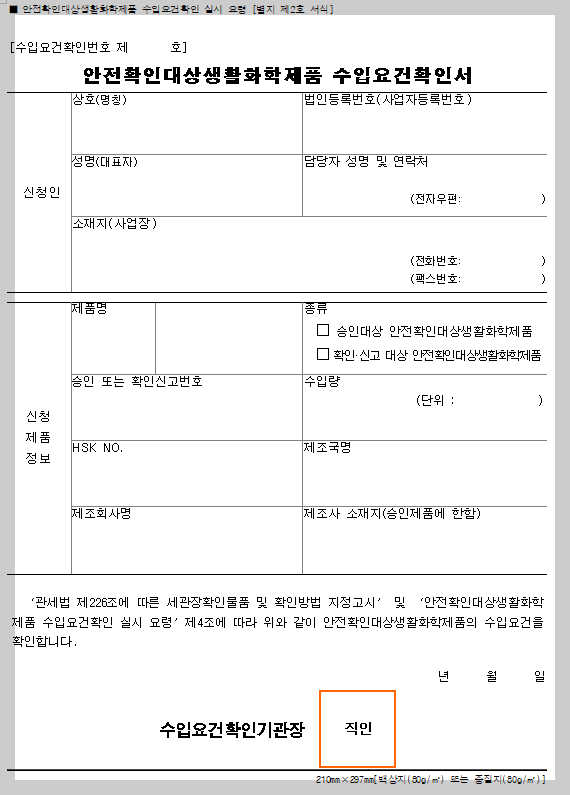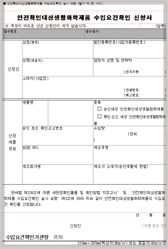 수입요건확인서는 기본적으로 생활화학제품에 대해 이미 신고/승인을 받았어야 합니다. 즉, 생활화학제품에 대해 신고/승인번호가 있어야 하는 것이죠.