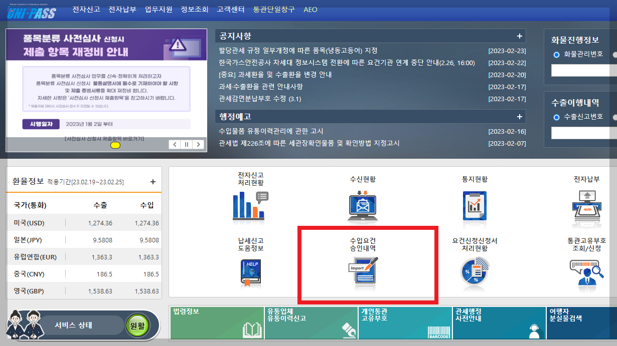 *참고로 발급받은 수입요건확인서의 잔량은 관세청 유니패스에서 확인할 수 있습니다. 유니패스 메인화면에서 중간 부분에 "수입요건 승인내역"을 선택한 뒤 수입요건 확인서에 기재되어 있는 확인번호로 검색하면 해당 서류로 수입한 물량과 남아있는 물량을 확인할 수 있습니다.