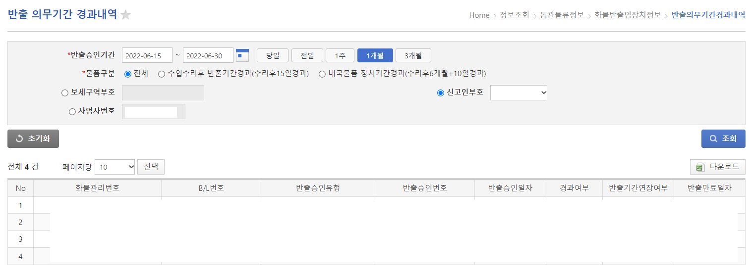 반출 승인기간은 수입신고 수리일입니다. 수리일 기준으로 조회해보면 아래 내용이 뙇...!