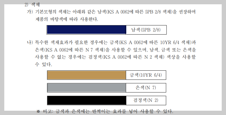 다만, 위 색상을 사용했을 경우 제품에 표시된 적합성평가표시의 식별이 용이하지 않은 등 부득이한 상황에서는 다른 색채를 사용할 수 있습니다.