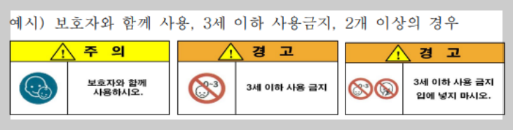 앞서 살펴본 표시사항들은 어린이제품 구분에 따른 개별 표시사항인데요. 인증 구분에 관계없이 어린이제품이라면 공통으로 표시해야 하는 주의 또는 경고 표시도 있습니다. 함께 살펴봐야겠죠?