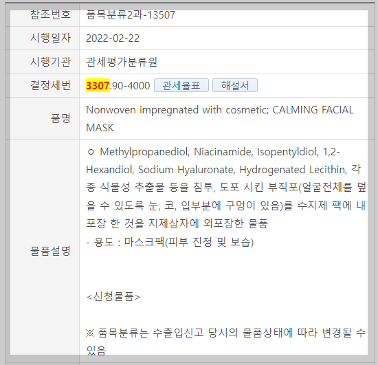 일부 마스크팩의 경우 3307호의 기타 따로 분류되지 않은 화장품이나 화장용품으로 분류되기도 합니다. ;;;