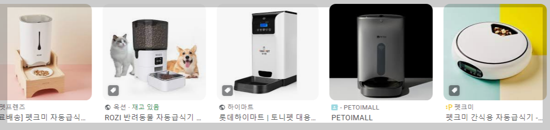 아니면 우측 예시 사진 맨 오른쪽과 같이 사료나 간식을 담아두면 정해진 시간에 자동으로 뚜껑이 열리면서 반려동물들이 먹을 수 있게 해 둔 것도 있고요.
