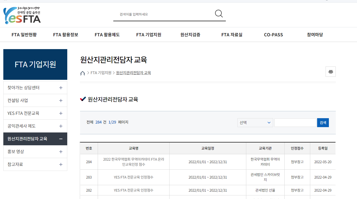 YES FTA 사이트 -> FTA 기업지원 -> 원산지관리전담자 교육 선택