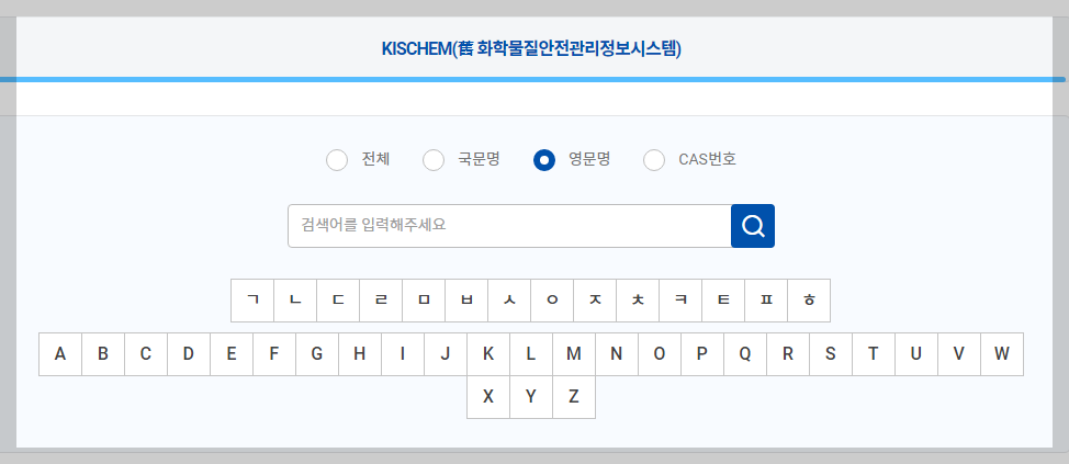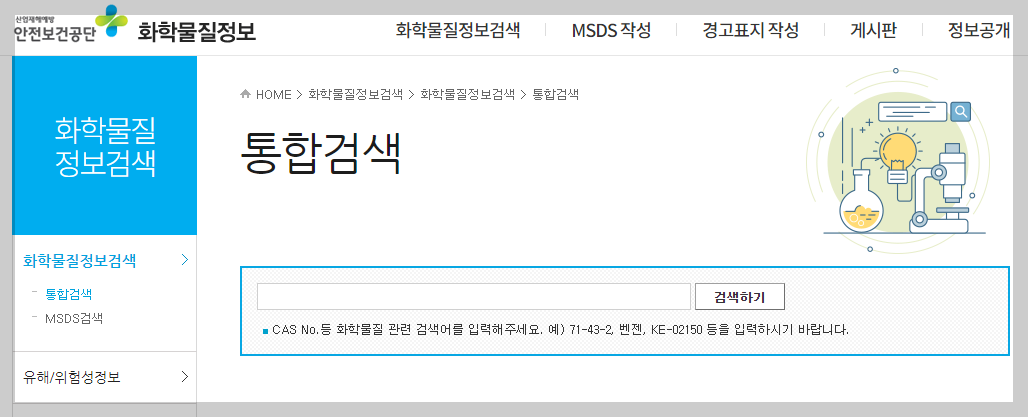 화학물질 검색을 통해 제공되는 정보는 참고 목적으로만 이용하시고, 어떠한 경우에도 제공되는 내용으로 인한 민형사상의 법적 책임을 지지 않음을 알려드립니다 –라는 무서운 문구와 함께 검색 화면이 뜹니다. ㄷㄷㄷㄷ
