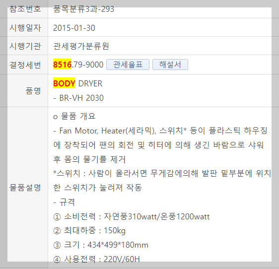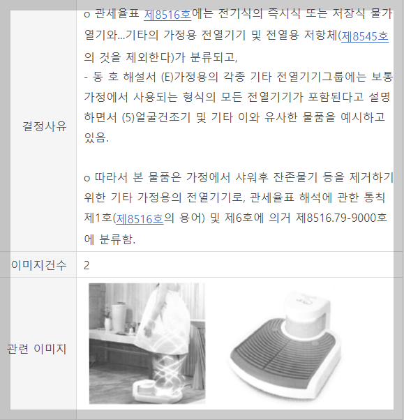 바디 드라이어에 대한 관세청 분류사례도 있습니다.
