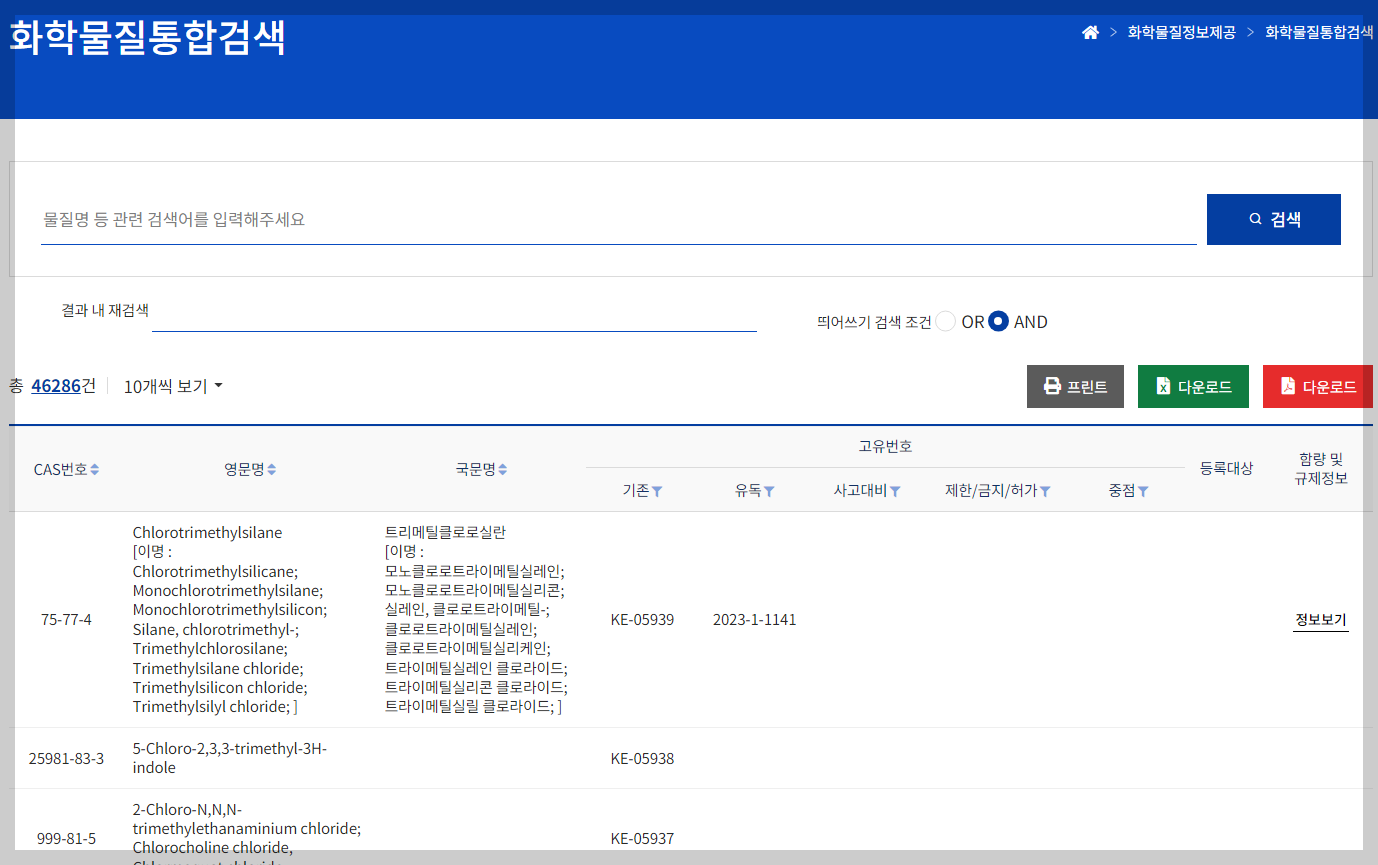 화학물질통합검색 화면에서 물질명이나 CAS번호 등 검색어를 입력하고 검색하면 아래 화면과 같이 고유번호와 유해화학물질 여부를 확인해 볼 수 있습니다.