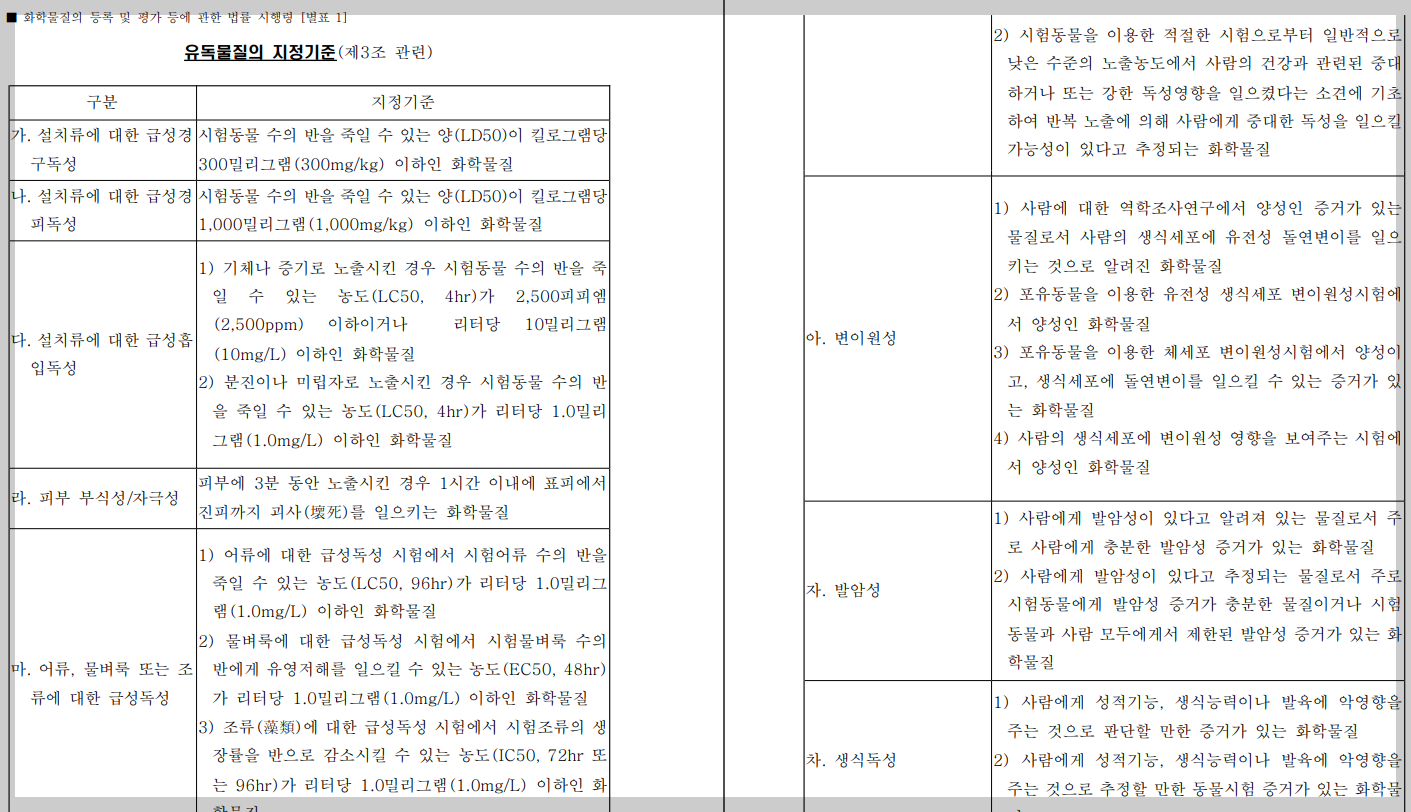 어떠한 것들이 유독물질로 규정되어 있는지 궁금하신 분들은 유독물질의 지정고시를 법제처에서 다운로드하시거나 화학물질정보처리시스템 사이트에서 검색해보시면 됩니다.
