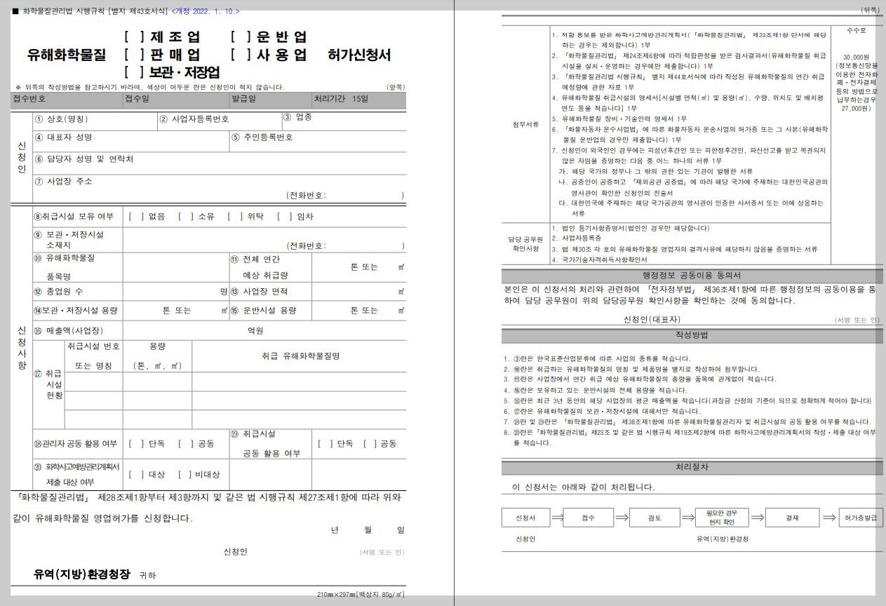 오늘은 유해화학물질을 제조하거나 판매, 보관·저장 등 영업의 종류와 허가절차에 대해 정리해 보았습니다.