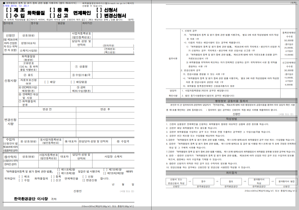 상기 [1]에 따른 화학물질 등록 또는 신고 면제대상에 해당함을 확인하셨다면 환경부에 면제확인을 신청해서 확인을 받아야 합니다. 먼저 아래 서식의 면제확인신청서를 작성해서 제출해야 합니다. (화평법 시행규칙 제7조)