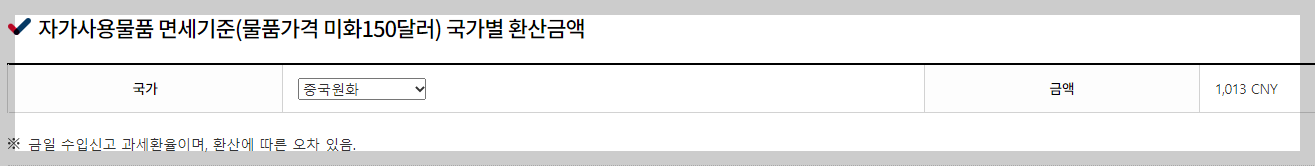 관세청 예상세액 조회시스템에서 직구한 국가를 선택하면 그날의 환율을 적용해서 150달러 기준을 제시해줍니다.