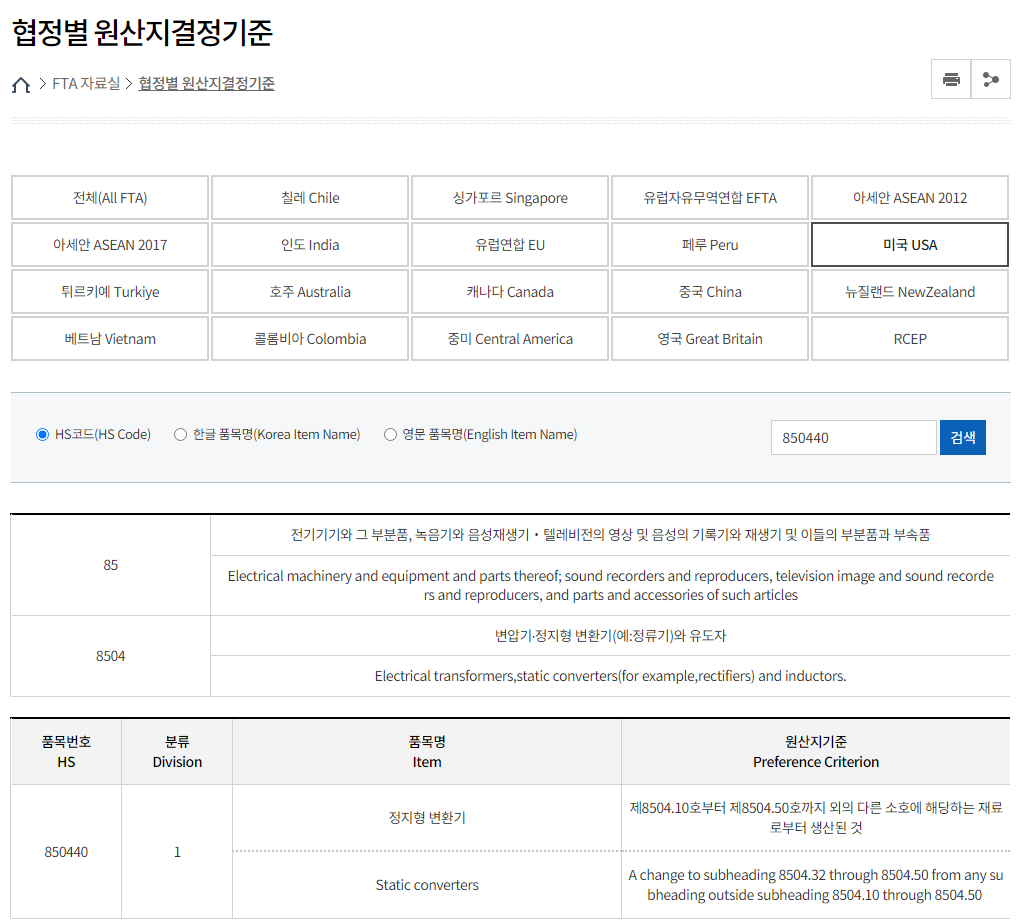 미국으로 선택하고 HS코드 8504.40호를 입력 후 검색을 눌렀더니 아래와 같이 원산지 기준이 나옵니다.