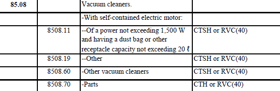8508호에는 진공청소기가 분류되고, 진공청소기의 품목별 원산지결정기준은 위와 같습니다. 진공청소기는 6 단위 세번변경(CTSH)이 이루어졌거나 부가가치 40% 이상(RVC 40)을 충족하면 원산지로 인정되네요.