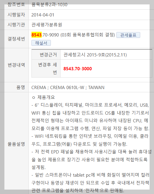 *이북리더기에 대해 2015년 품목분류 변경고시가 나오면서 아래와 같이 변경되었습니다.