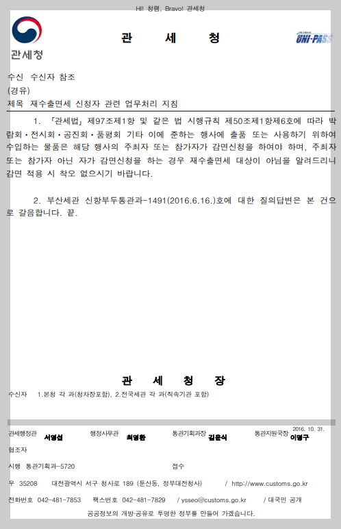 1. 관세청 총괄1275-1220('863.6.11.) 및 1275-583('84.3.31.)호의 재수출면세규정 운용철저 공문