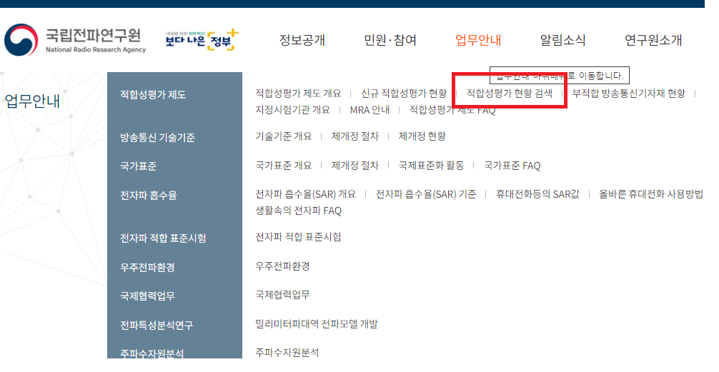 메인 화면에서 업무안내 → 적합성평가 제도 → 적합성평가 현황 검색으로 들어가시면 됩니다. 제품에 쓰여있는 인증번호로 조회하시면 누가, 언제 인증을 받았는지 확인해보실 수 있습니다.